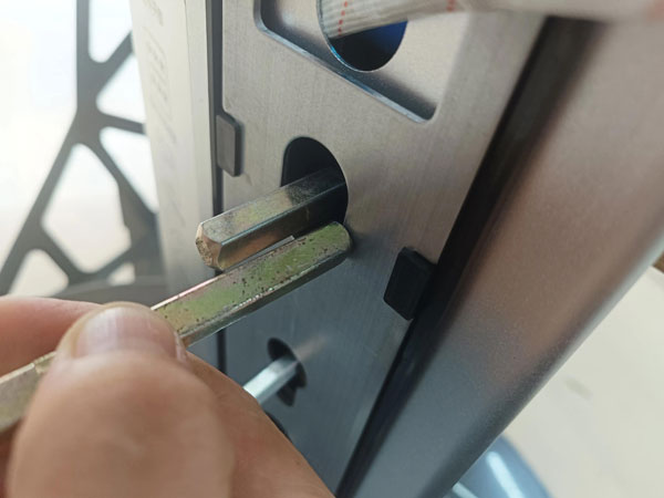 如果机械钥匙开关门不顺畅,我们要检查一不面板机械锁芯孔是否对准锁芯,如果对准了锁芯,那么很可能就是门套上的扣板孔太小了,使用锉刀将孔扩大一点就可以了。